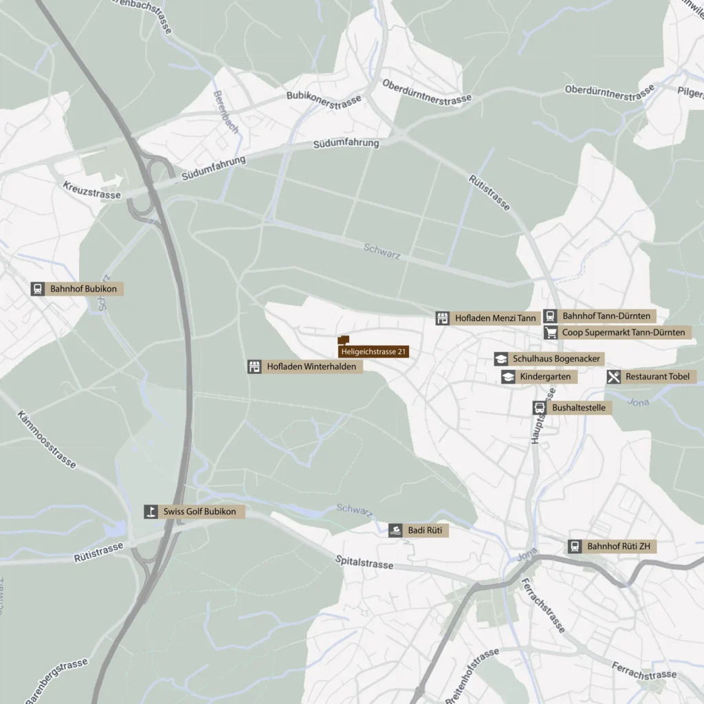 Die Liegenschaft liegt in einem familienfreundlichen Wohnquartier, eingebettet in eine verkehrsarme Seitenstrasse mit viel Grün – ein Ort, an dem man sich sofort willkommen fühlt. Trotz der wohltuenden Zurückgezogenheit ist das Quartier bestens erschlossen: Der Bahnhof Tann-Dürnten sowie Rüti ZH befinden sich in der Nähe, und auch der Bahnhof Bubikon mit Direktverbindungen nach Zürich ist schnell erreicht – ideal mit dem Velo oder zu Fuss.